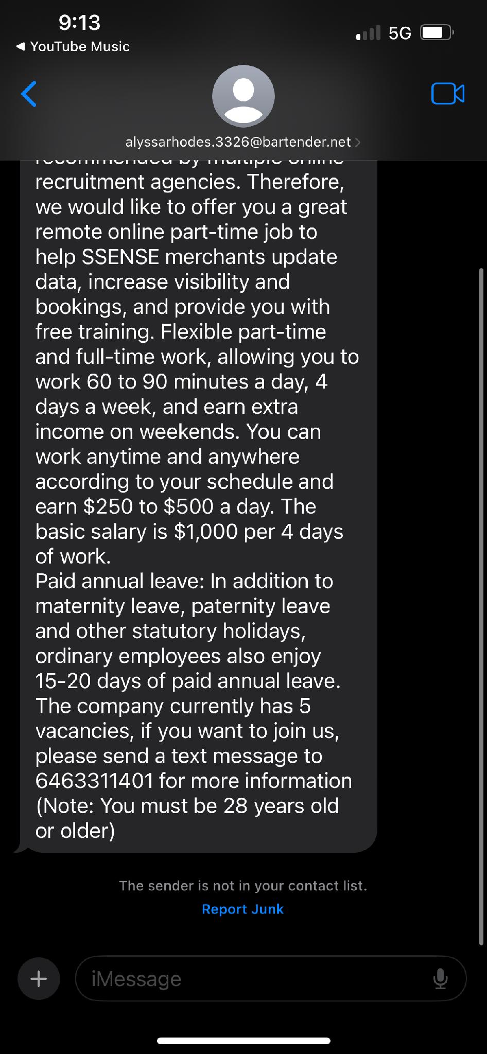 We’ve received reports of fraudulent job offers being sent to members of the Illinois State University community via text and email. These messages claim to offer high-paying remote jobs with SSENSE or other companies and often come from suspicious email addresses (e.g., alyssarhodes.3326@bartender.net) or ask you to text a personal number for more information.
