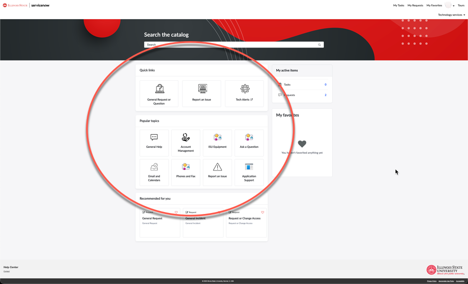- Navigate to ServiceNow at https://illinoisstate.service-now.com/esc and log in via Central Login.