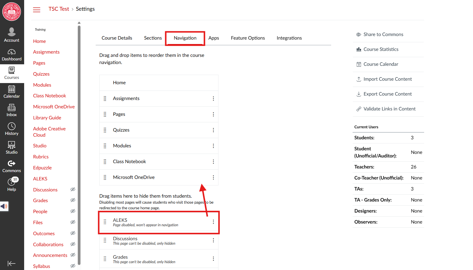 - In the course Settings, select the Navigation tab, and scroll-down to locate ALEKS in the hidden items section, and drag ALEKS up to the non-hidden section above (Figure 1):