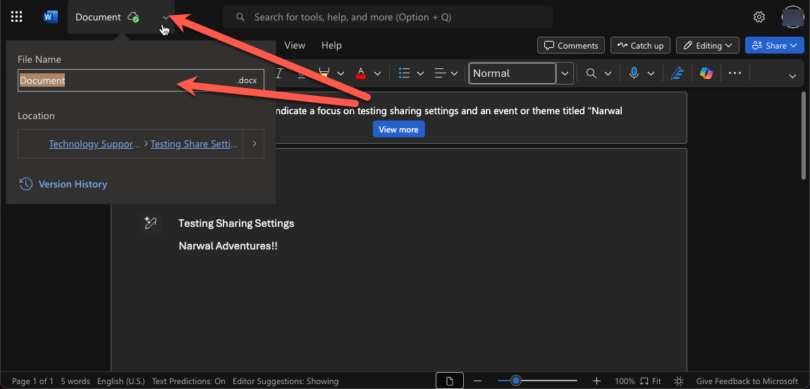 - Click the drop-down arrow next to the document's name.