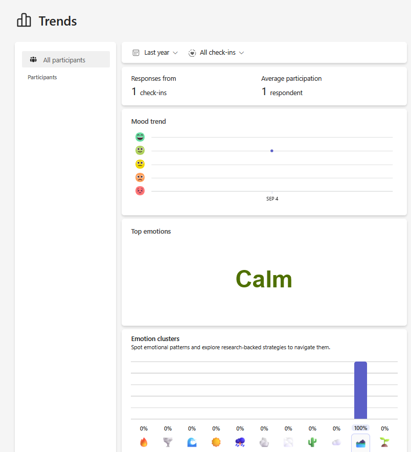 - Trends: See an overview of check-in responses over time to identify trends in your class. You can view data on responses, participation rates, and other insight into your students' well-being.
