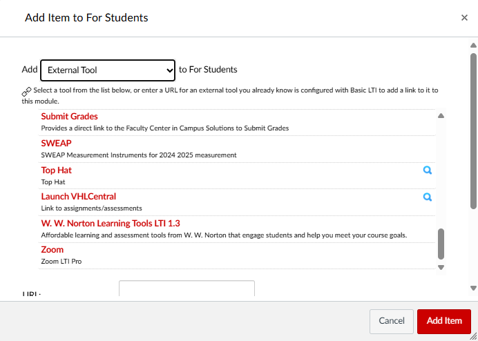 To add the SWEAP LTI to your Canvas Course, first Navigate to the homepage of the Course you would like to add SWEAP to, open the Modules section and Create a New Module or Click the + sign on an existing one that you would like to add SWEAP to. Once you've created or selected that module, a pop-up window should open. Click the drop down menu and select External Tool, then scroll down until you find SWEAP. Click on it, then select Add Item. SWEAP should now be available within the module. (Figure 1)