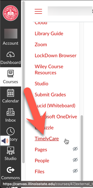TimelyCare may be found on the course navigation bar in ISU Canvas courses (Figure 1). This feature is enabled by default. If you don't see this option in your course, your instructor may have disabled the feature in Canvas course navigation settings.
