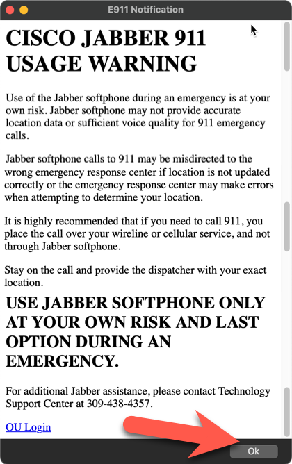 When university members log into Jabber, they will be presented with a pop-up containing an informational 911 usage warning (Figure 1). You will need to read the warning and acknowledge by clicking OK in order to be able to use Jabber. If you do not click OK, Jabber will not be able to connect to the network and will remain non-functional.