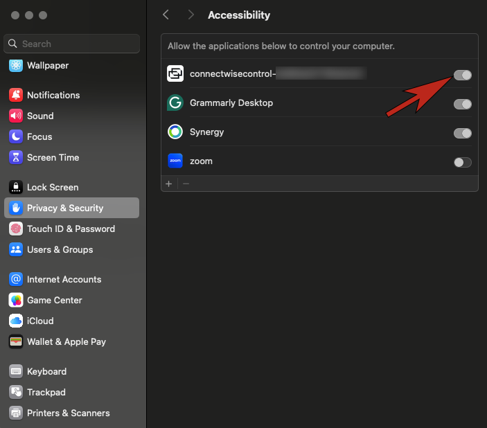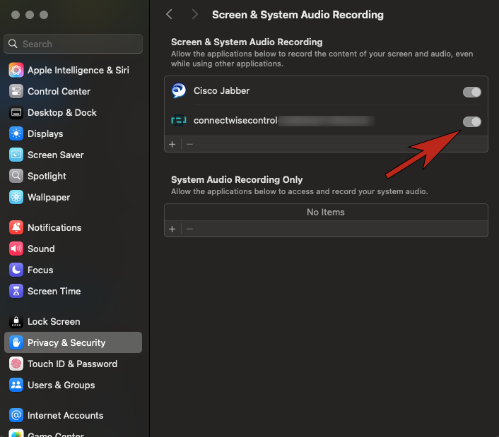 Figure 6: - Once Accessibility and Screen & System Audio Recording have been modified to enable ScreenConnect Client and/or ConnectWise Control Client. The TSC Analyst should now be able to view and interact with your Mac computer.